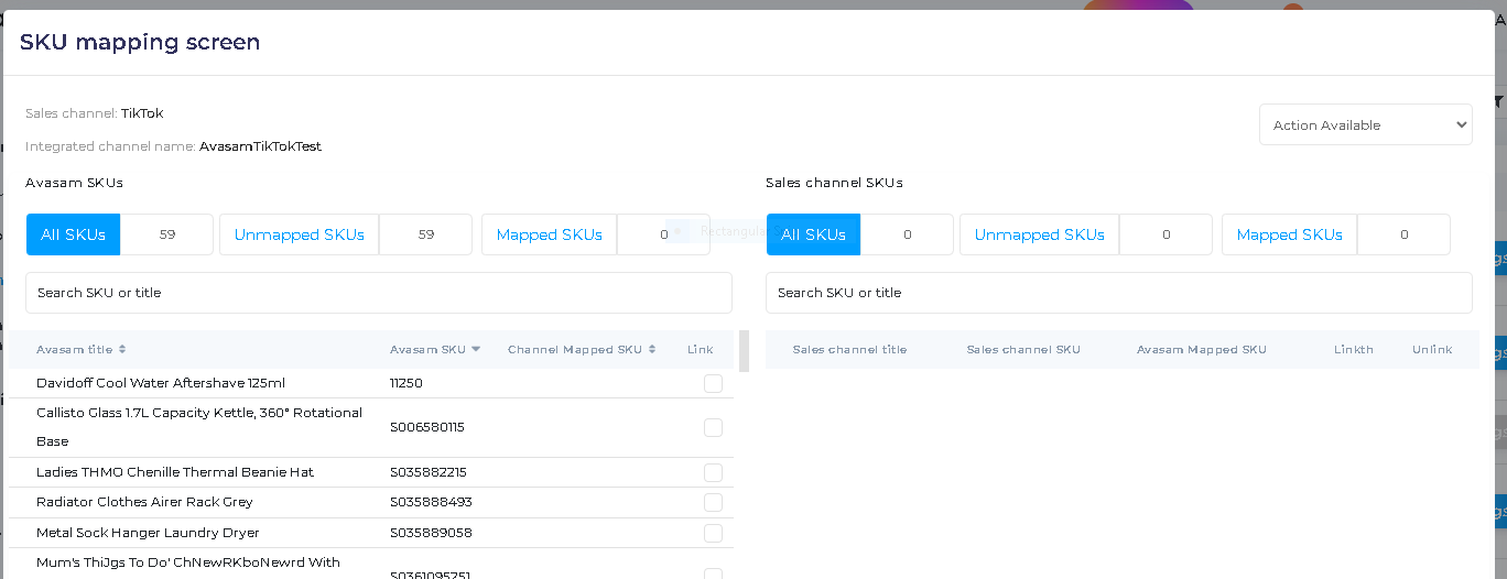 - Search for the Avasam SKU to map this against under the Avasam SKU heading, then select the SKU and click ‘map them’ to the right of it.