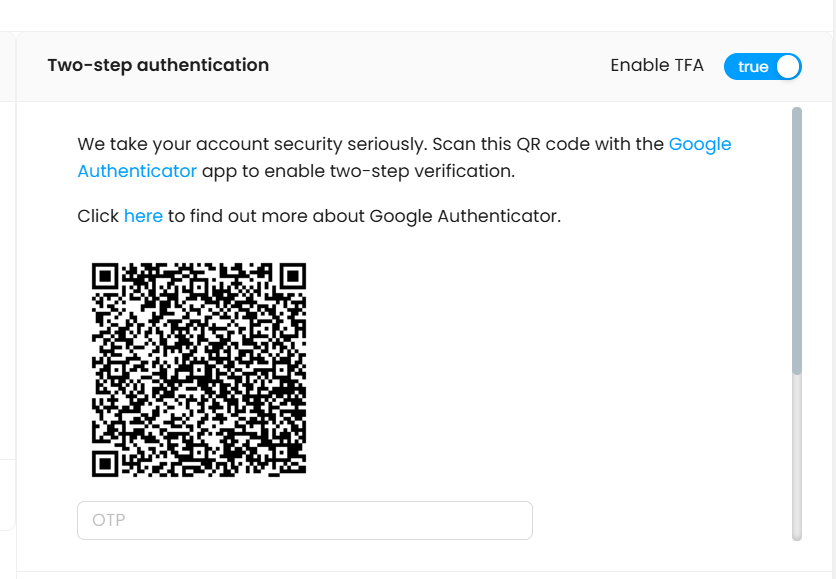 - Scan this QR code with the Google Authenticator app to enable two-step verification.