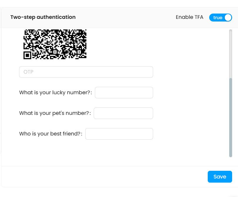 - Make sure to fill the Security questions provided below, along with the OTP provided in the Google Authenticator app once the QR is scanned and then click on Save
